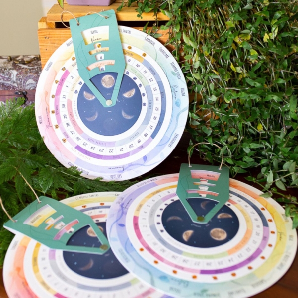 Calendário montado com 7 círculos sobrepostos em papel 300g e base empastada (firme para o manuseio). Incluso fio rami na régua marcadora central, idealizado para ser pendurado.